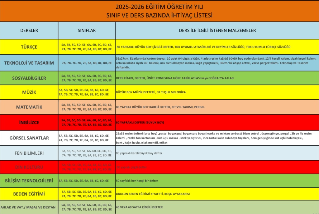 2025-2026 EĞİTİM ÖĞRETİM İHTİYAÇ LİSTESİ